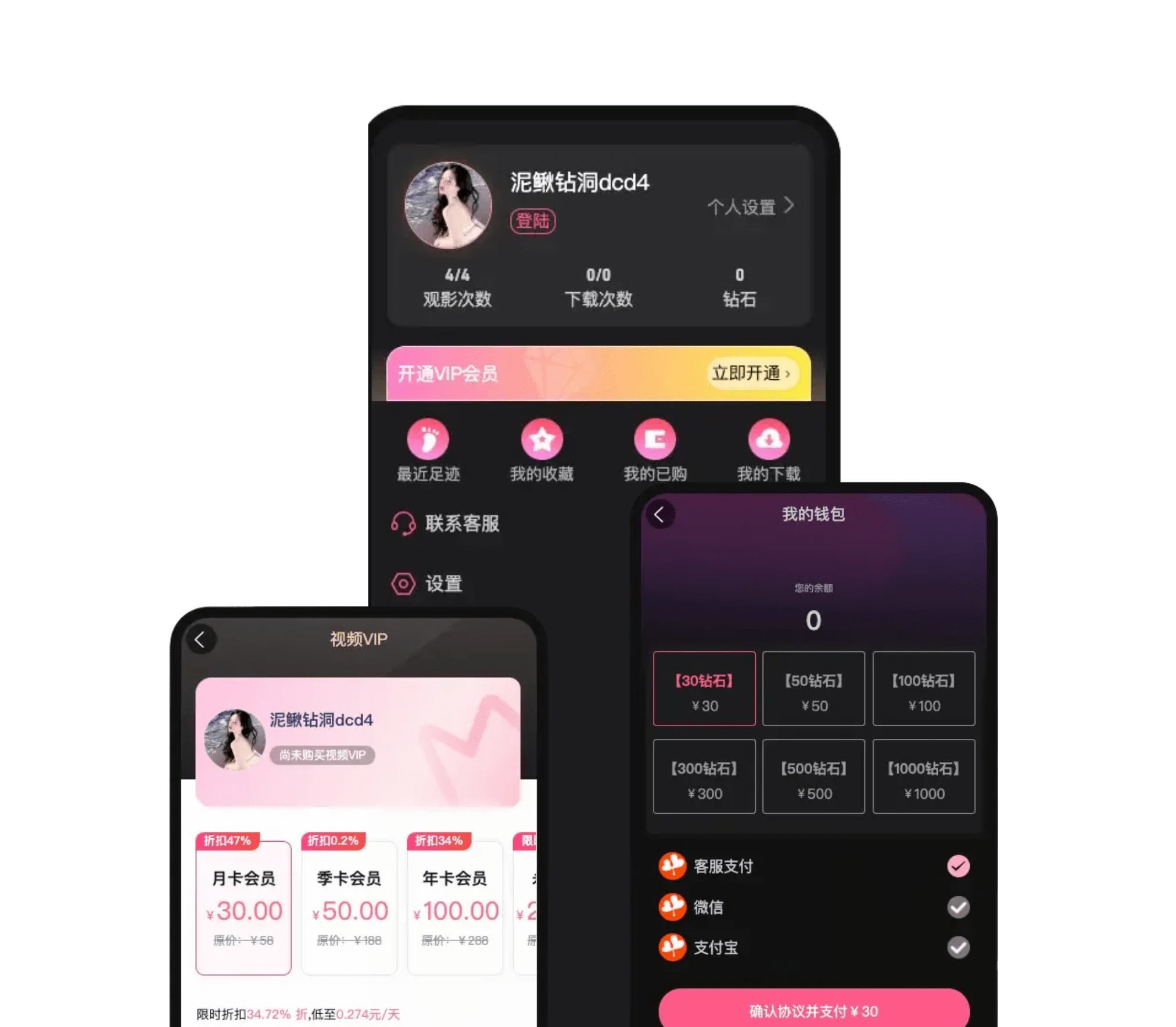 支持试看、收费或免费模式VIP模式,vip跳过广告。